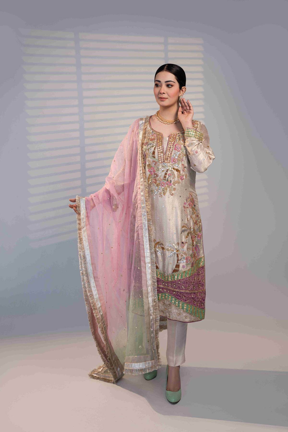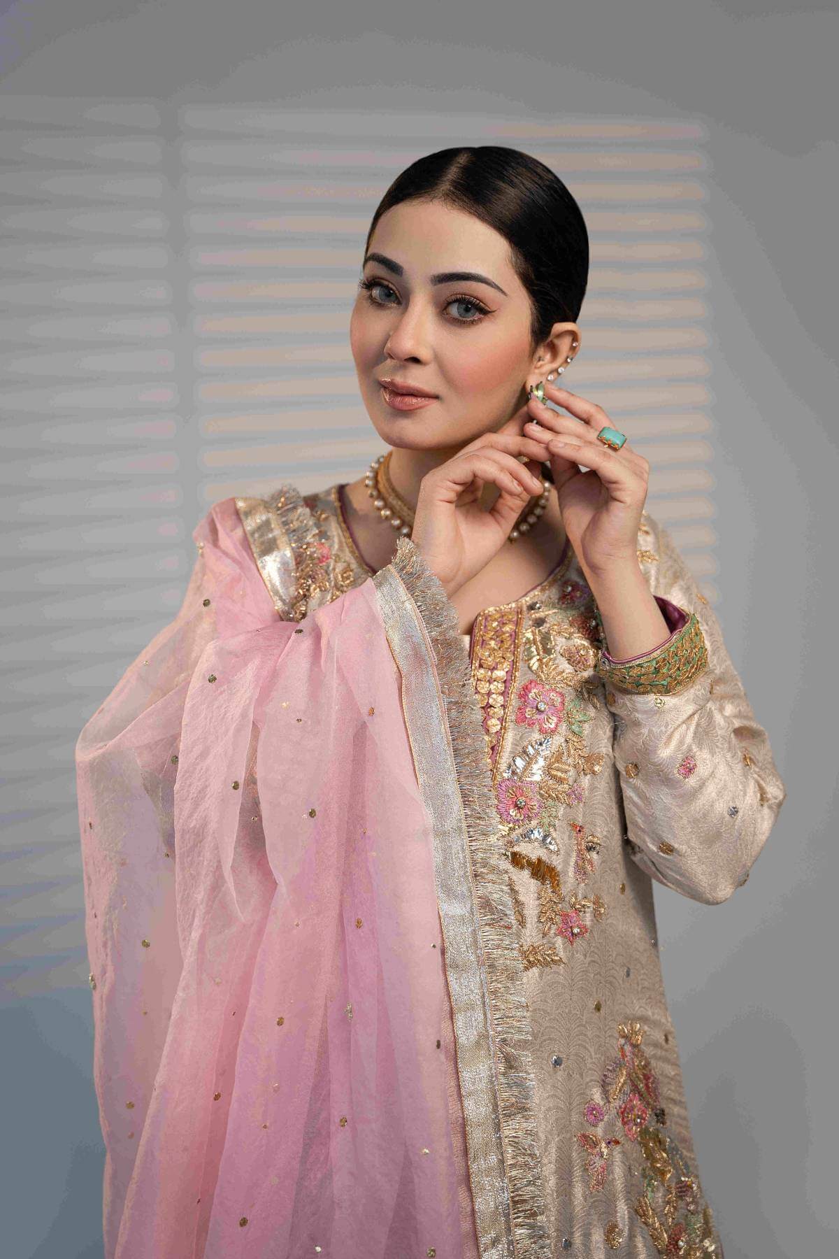 An exquisite ensemble showcasing a timeless ivory jamawar shirt, impeccably paired with a delicate tissue sharara or sleek straight raw silk pants.