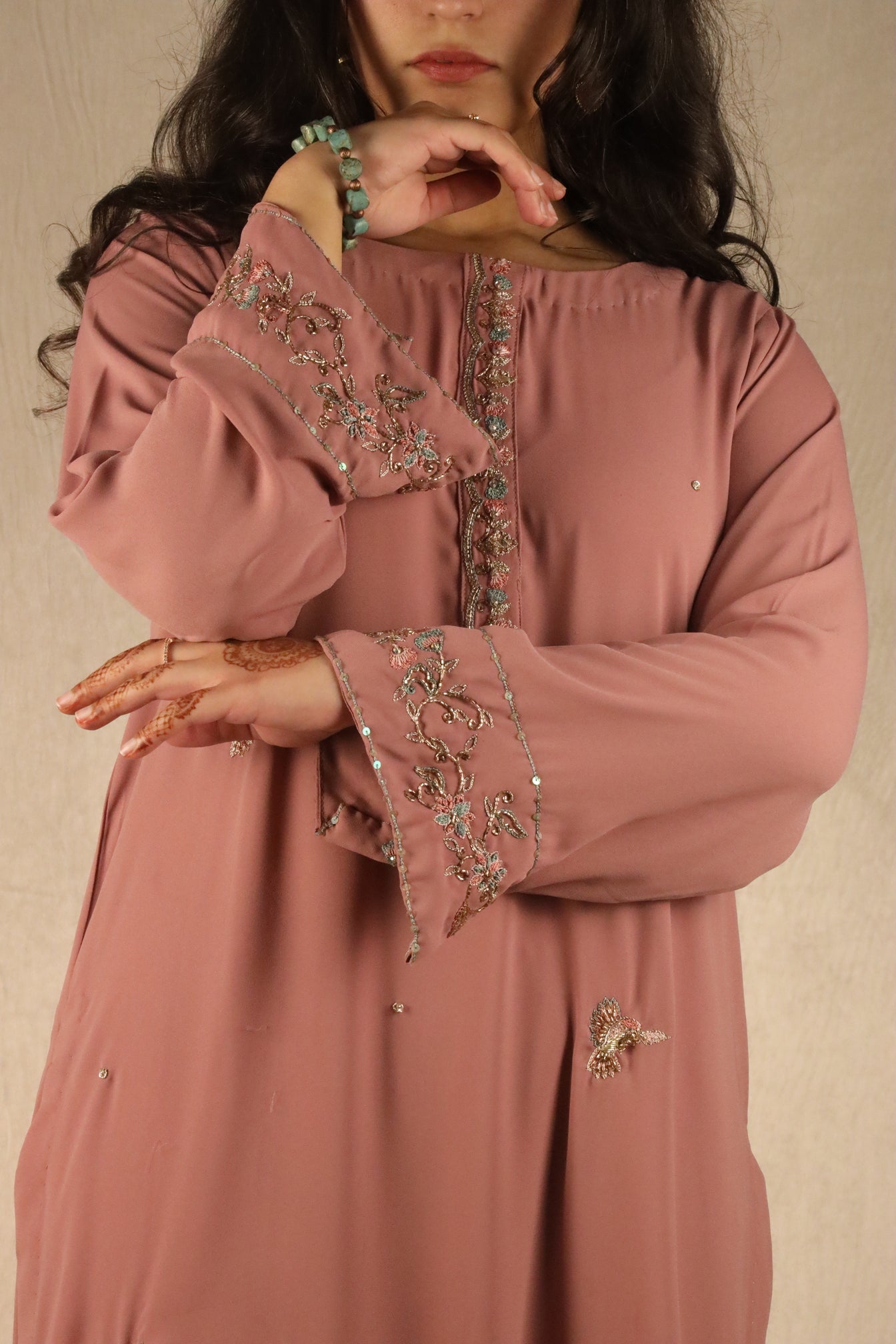 - Hand-embroidered, hand embellished