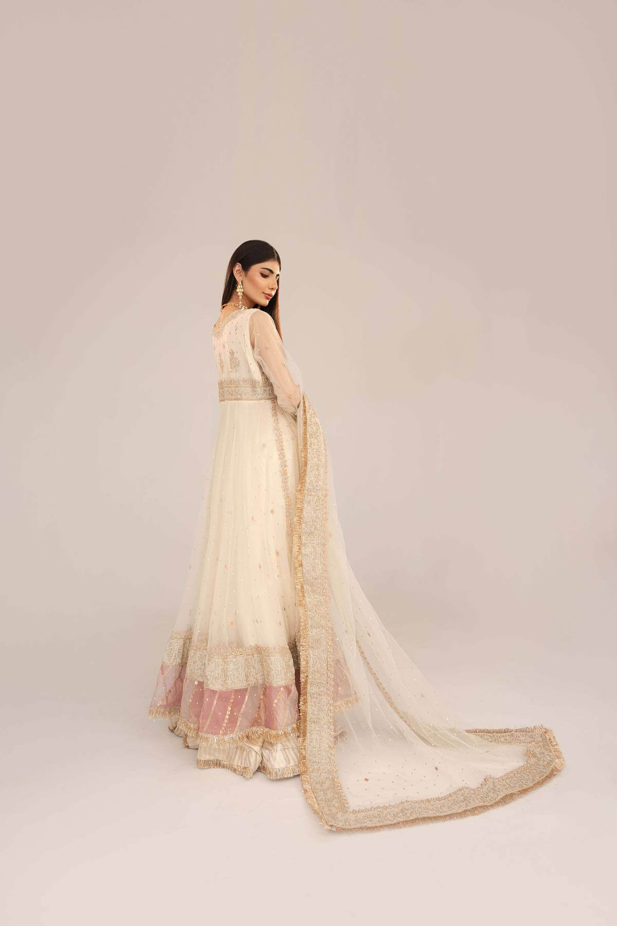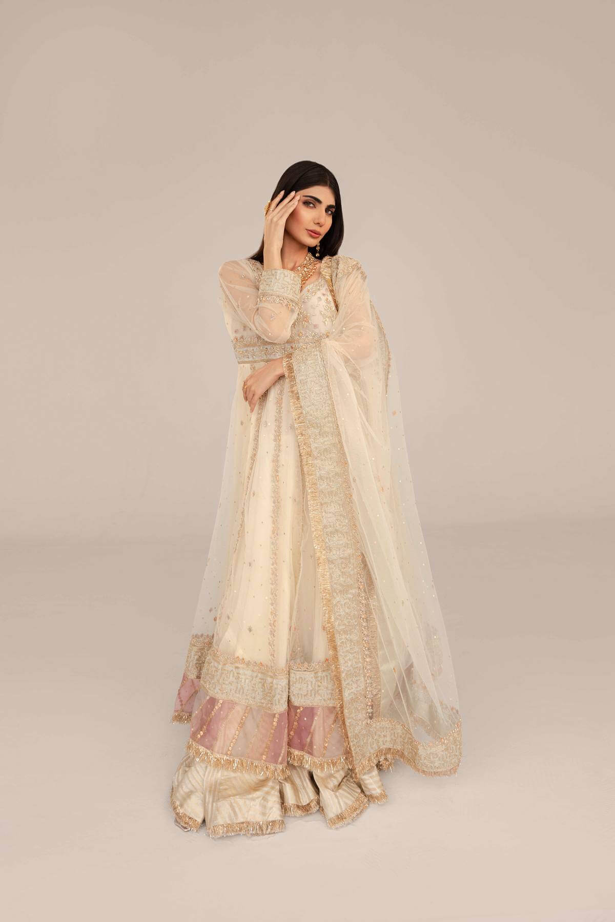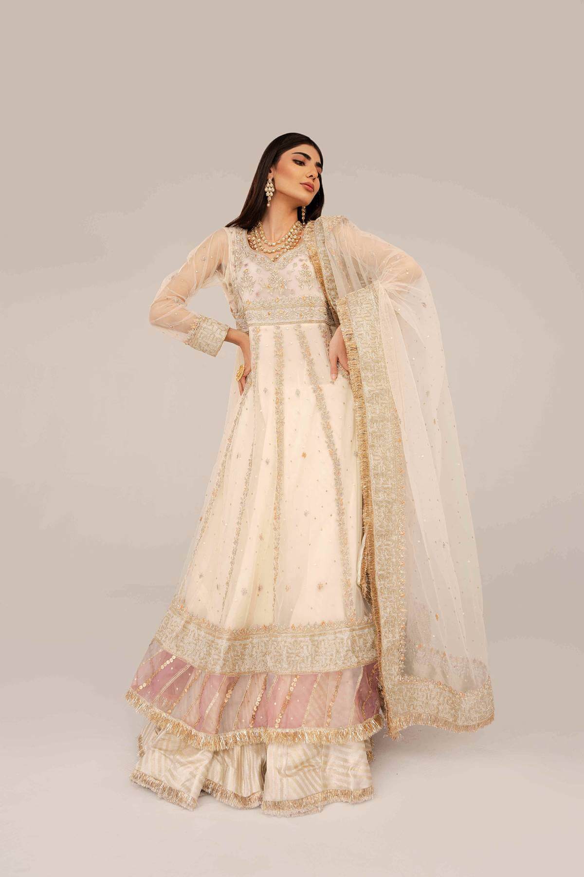 The pishwas is paired with a traditional, flowy gharara- finished to perfection with kiran and gota.
