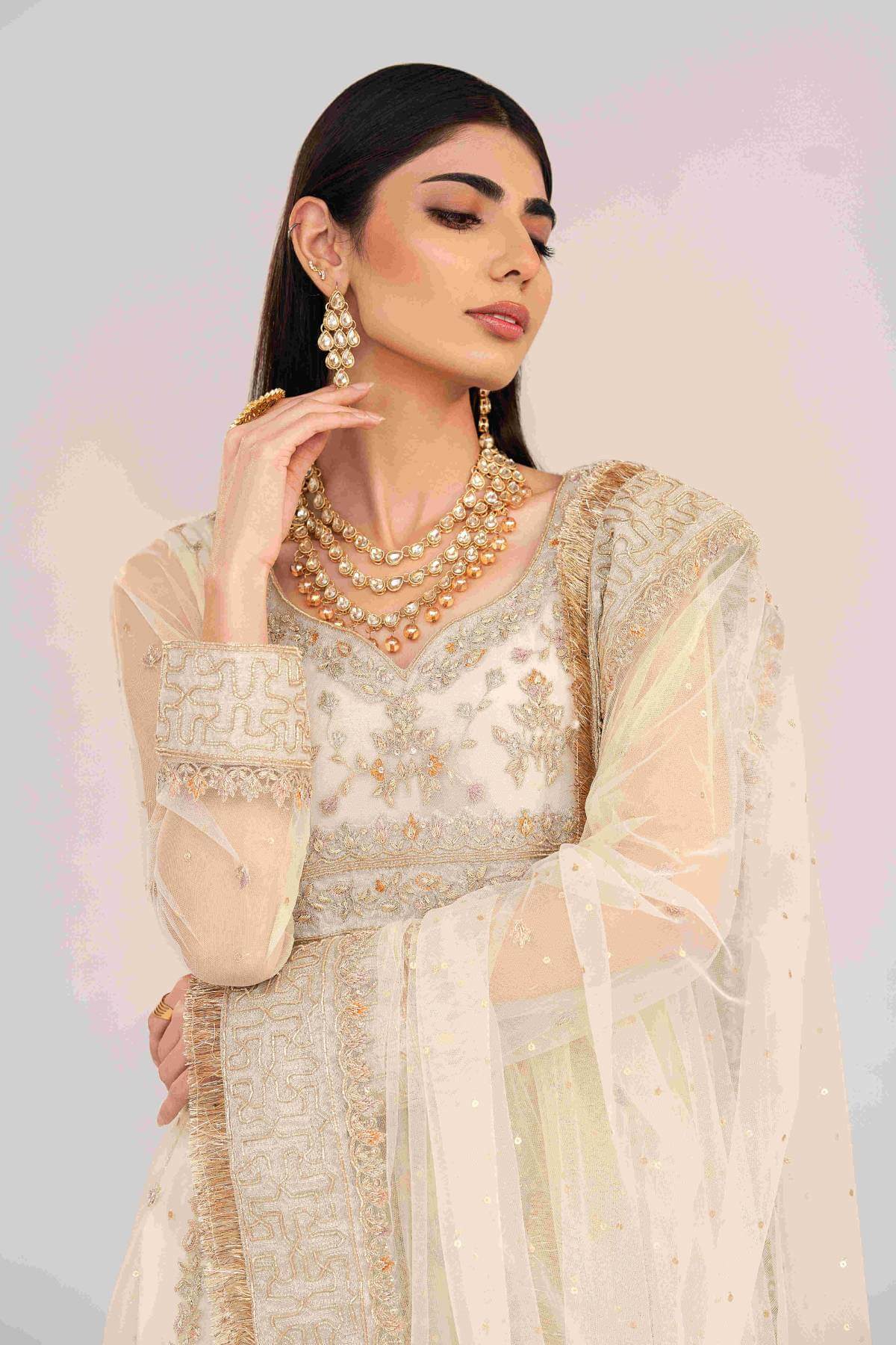 A flowy, celestial silhouette intricately adorned with a mixture of: dabka, succha gota, tila, sequin work and hues of resham- incorporating floral bouquets, branches and geometric patterns throughout its design.