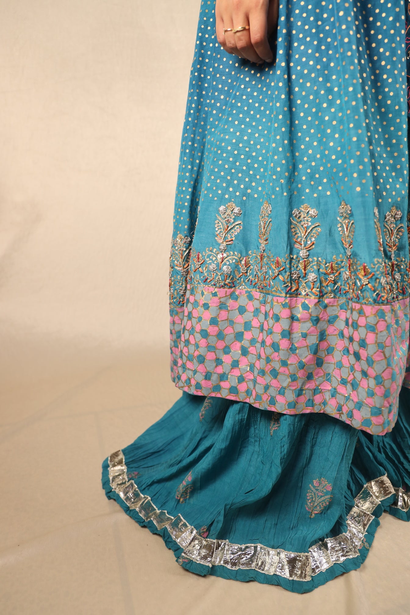 - Block printed, hand embellished, hand-embroidered