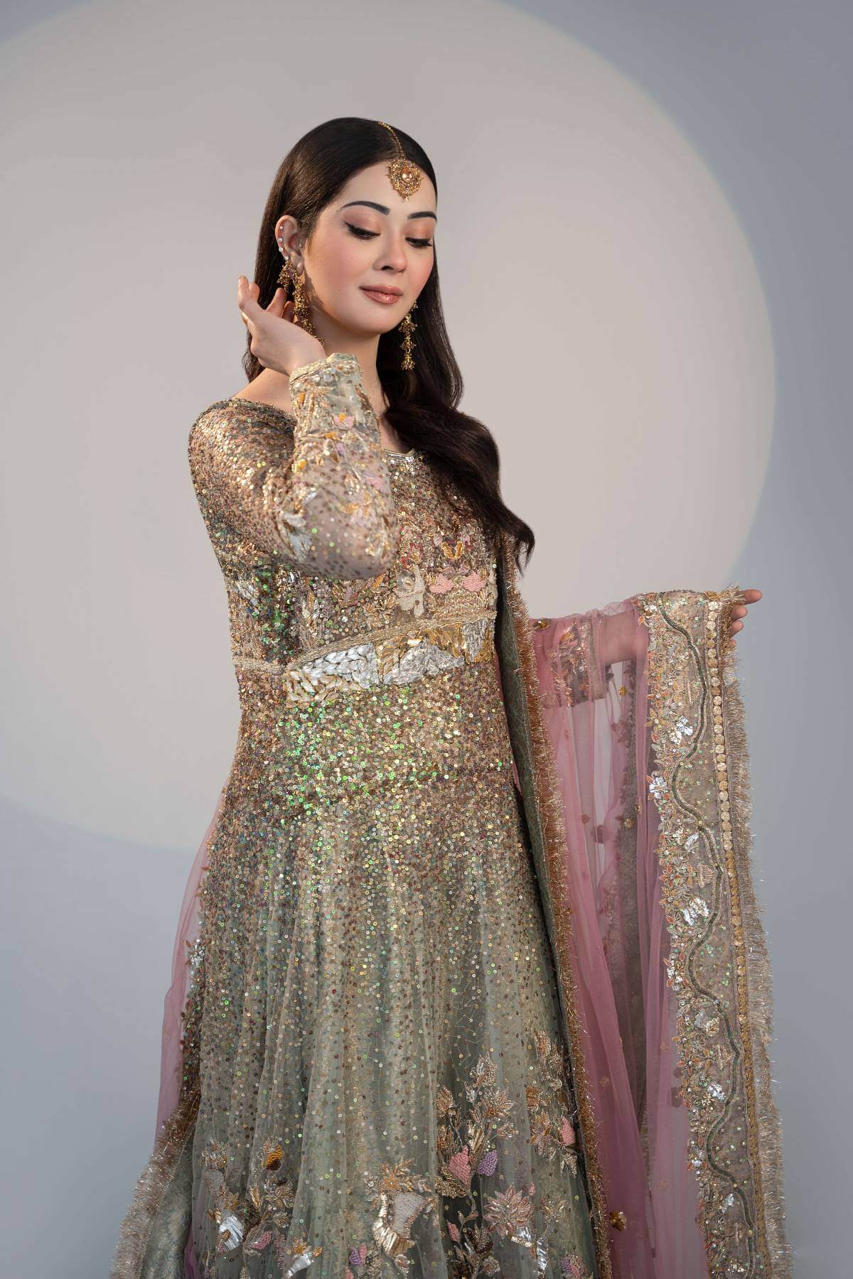 This bridal look features a minty hued pishwas with intricate, hand woven embellishments. The visuals are created using various materials including mukaish, gota, sitara, dabka/tila and much more!